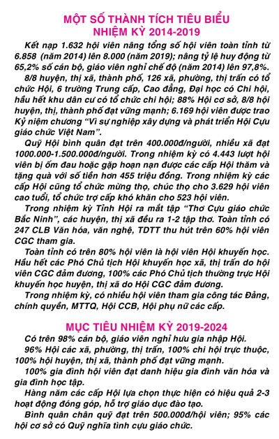 Trải qua 3 nhiệm kỳ, các cấp Hội hoạt động hiệu quả với hơn 98% cán bộ, giáo viên nghỉ hưu gia nhập Hội, đến nay toàn tỉnh có gần 8.000 hội viên. Hoạt động của Hội ngày càng thiết thực và hiệu quả, thực hiện Nghị quyết số 29-NQ/TƯ, ngày 4-11-2013 của Ban Chấp hành Trung ương Đảng (khóa XI) về: “Đổi mới căn bản, toàn diện giáo dục và đào tạo, đáp ứng yêu cầu công nghiệp hóa, hiện đại hóa trong điều kiện kinh tế thị trường, định hướng xã hội chủ nghĩa và hội nhập quốc tế”, Ban Chấp hành Đảng bộ tỉnh đã ban hành Nghị quyết số 12-NQ/TU ngày 26-6-2014 về “Đổi mới căn bản toàn diện giáo dục và đào tạo tỉnh Bắc Ninh giai đoạn 2014-2020, định hướng đến năm 2030.