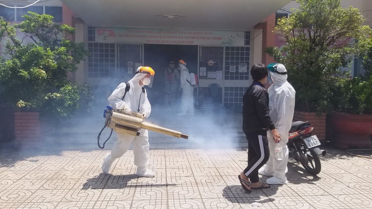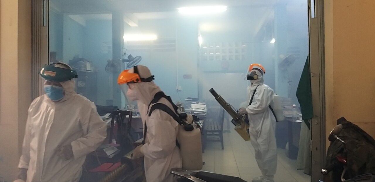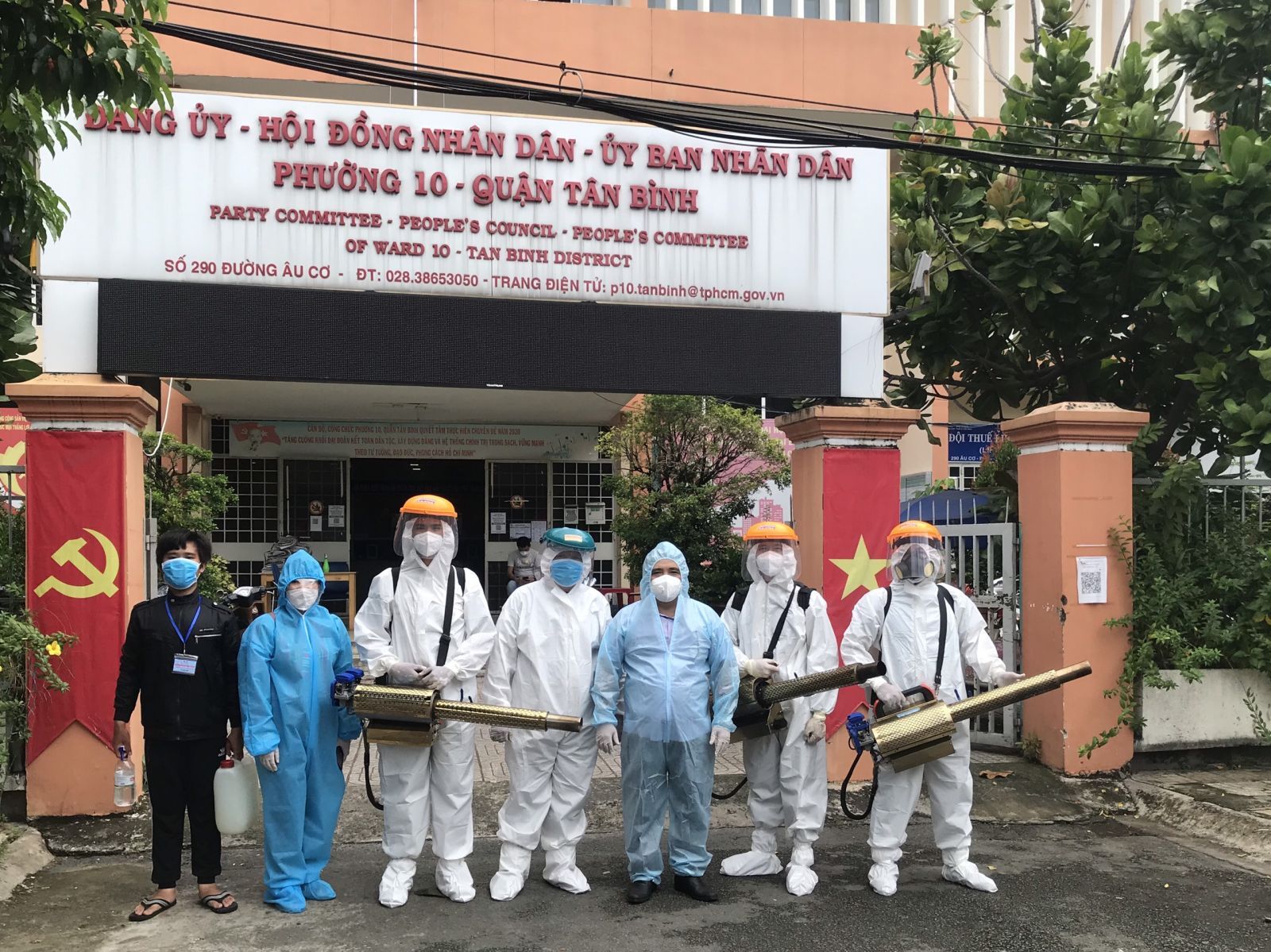 Đội Sài Gòn 24 giờ, phun khử khuẩn tại UBND phường 10, quận Tân Bình chụp hình lưu niệm cùng phóng viên