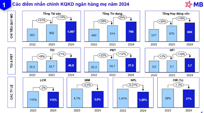 Tại hội nghị, ông Đàm Nhân Đức – Kinh tế trưởng MB cho biết, về kết quả kinh doanh của MB, đến hết năm 2024, tổng tài sản đạt hơn 1 triệu tỷ đồng, tăng 18% so với đầu năm. Tín dụng tăng 25% (766,000 tỷ đồng), huy động vốn tăng 19% (800,000 tỷ đồng). Tổng thu nhập Ngân hàng năm 2024 đạt 46.8 ngàn tỷ đồng, tăng 21%, trong khi lợi nhuận trước thuế đạt 27.6 ngàn tỷ đồng, tăng 12% so với năm trước.