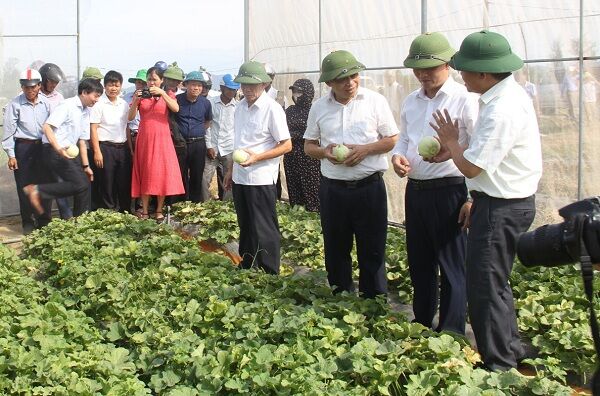 Lãnh đạo Hội Nông dân tỉnh Nghệ An, huyện Nghi Lộc thăm quan mô hình trồng dưa lê, dưa hấu sạch theo tiêu chuẩn VietGAP của nông dân xã Nghi Long (Nghi Lộc)