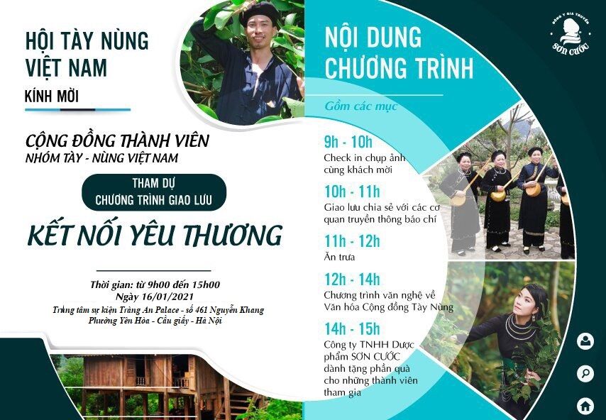 Theo dự kiến, Chương trình giao lưu “Kết nối yêu thương” sẽ được diễn ra từ 09h - 15h ngày 16/01/2021 tại Trung tâm sự kiện Tràng An Palace - số 461 Nguyễn Khang, Phường Yên Hòa, Cầu giấy, Hà Nội với nhiều sự kiện được tổ chức trang trọng như check-in, chụp ảnh lưu niệm với khách mời; giao lưu, chia sẻ với các cơ quan truyền thông, báo chí; liên hoan tiệc với các món đặc sản vùng miền; giao lưu văn nghệ các tiết mục văn hóa cộng đồng Tày - Nùng. Thành lập quỹ người Tày Nùng để có cơ hội giúp đỡ những hoàn cảnh khó khăn tại bản làng người Tày Nùng ở những nơi rẻo cao, biên giới.