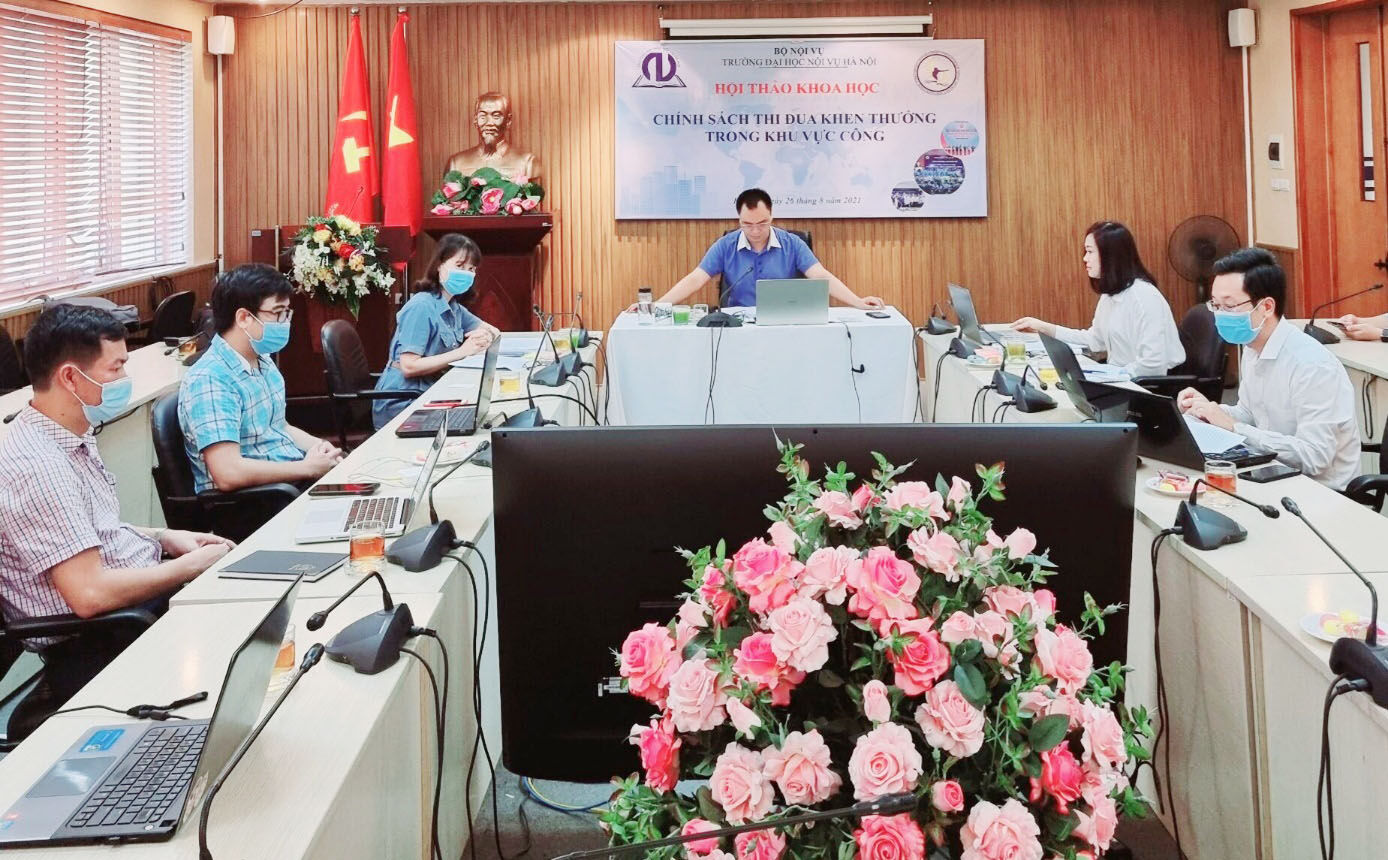 Sáng 26/8, Trường Đại học Nội vụ Hà Nội đã long trọng tổ chức Hội thảo khoa học "Chính sách thi đua khen thưởng trong khu vực công" thông qua hình thức trực tuyến. PGS.TS Nguyễn Quốc Sửu, Phó Hiệu trưởng Nhà trường chủ trì Hội thảo; TS. Lê Thị Vân Anh, Trưởng khoa Khoa Khoa học chính trị; TS. Đoàn Thị Hòa, Trưởng phòng Quản lý đào tạo sau đại học đồng chỉ trì. Hội thảo diễn ra sôi nổi trên ứng dụng trực tuyến zoom đã thu hút đông đảo các chuyên gia, nhà khoa học, nhà quản lý, đại diện các cơ quan, đơn vị, giảng viên và các chuyên gia trong lĩnh vực chính sách thi đua khen thưởng tham dự.
