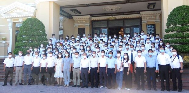 Sinh viên năm cuối Trường Đại học Y Dược, Đại học Huế lên đường hỗ trợ Thành phố Hồ Chí Minh chống dịch. (Ảnh: Tường Vi/TTXVN)