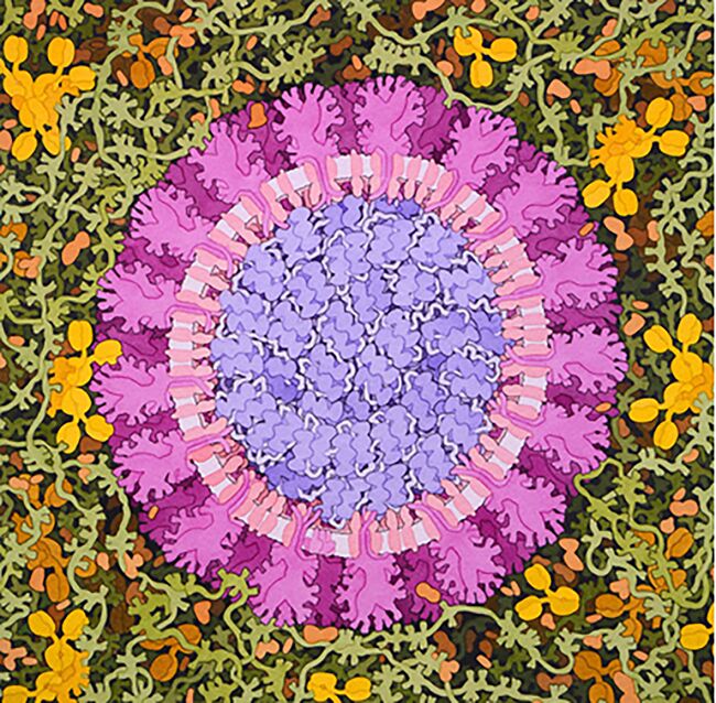 Hình vẽ một virus corona vừa xâm nhập vào phổi, bao giữa lớp màng nhầy do các tế bào hô hấp tiết ra trong đó có kháng thể và nhiều loại protein nhỏ của hệ miễn dịch. Hình vẽ này dựa trên các cấu trúc protein của virus corona trong Ngân hàng dữ liệu protein (PDB) kể từ dịch SARS đến nay. Nguồn: David S. Goodsell.