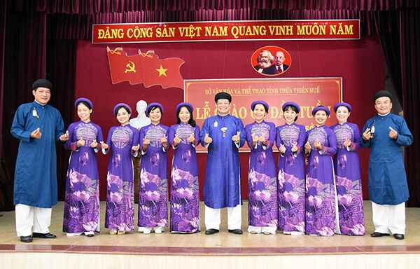 Ông Phan Thanh Hải (đứng giữa) cùng đội ngũ công chức ngành văn hóa Huế mặc áo dài truyền thống.