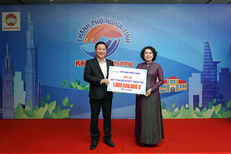Ông Trần Quốc Dũng – Phó Tổng Giám đốc Tập đoàn Hưng Thịnh trao tặng 1 tỷ đồng cho bà Tô Thị Bích Châu - Ủy viên Ban Thường vụ Thành ủy, Chủ tịch Ủy ban MTTQ Việt Nam TP.HCM – Đại diện Quỹ “Vì người nghèo TP.HCM".