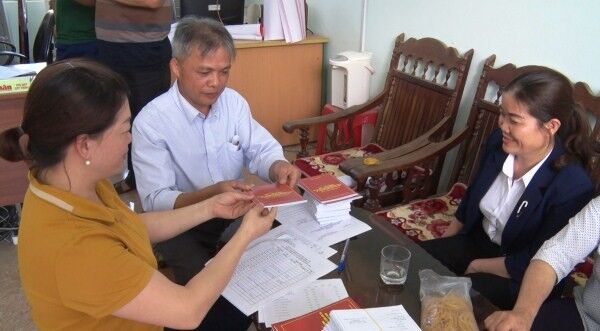 Thành viên Ủy ban Bầu cử thị trấn Nước Hai (Hòa An) cấp phát tài liệu học tập về bầu cử và thẻ cử tri cho các đơn vị bầu cử.