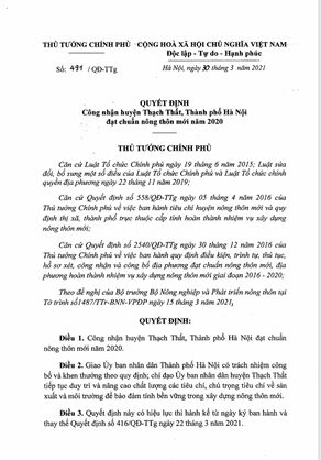 Ngày 30/3/2021, Thủ tướng Chính phủ đã ban hành Quyết định số 491/QĐ-TTg về việc công nhận huyện Thạch Thất, Thành phố Hà Nội đạt chuẩn nông thôn mới năm 2020.