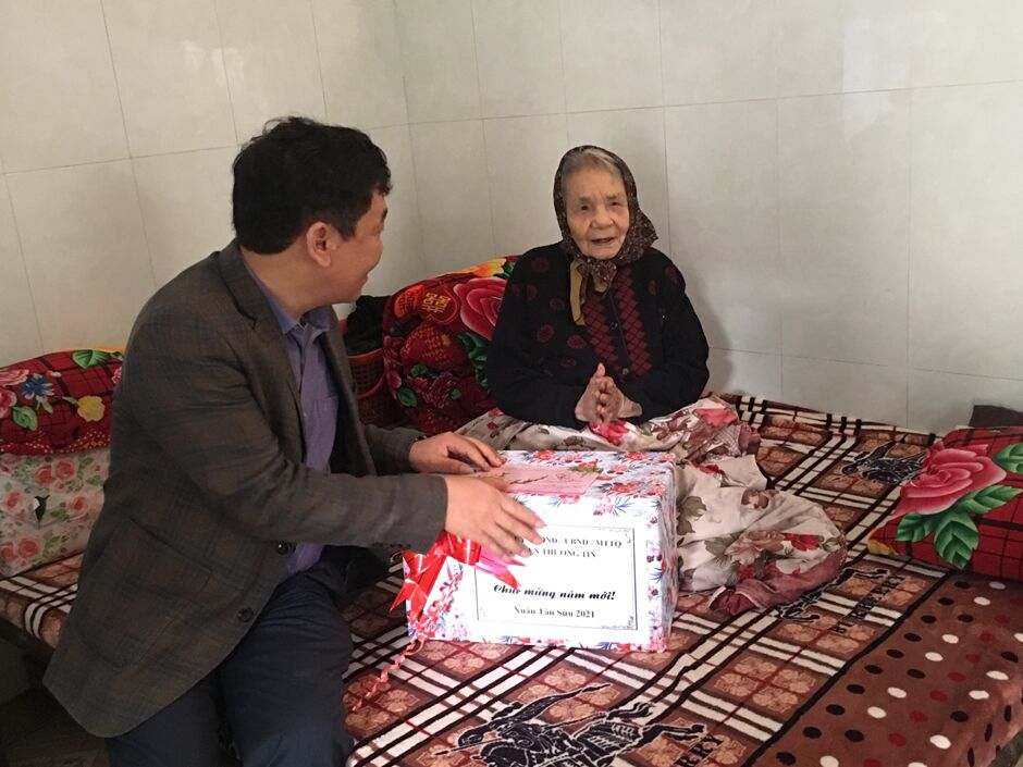 Đồng chí Chủ tịch UBND huyện đã trao tặng quà tết của Chủ tịch nước 1.000.000 đồng, quà của huyện 500.000 đồng cho bà mẹ Việt Nam anh hùng Nguyễn Thị Nhạn, trao tặng quà của Thành phố 2.500.000 đồng và quà của huyện cho Người có công tiêu biểu. Qua đó, Đ/c Kiều Xuân Huy thay mặt UBND huyện chúc các cụ bước sang năm mới với nhiều sức khỏe, trường thọ, đón xuân mới vui tươi đầm ấm; Đồng thời cũng đề nghị các cấp ủy Đảng, chính quyền, đoàn thể địa phương quan tâm, chăm lo để mọi người, mọi nhà đều có tết, đặc biệt là chăm lo tết cho các gia đình chính sách, người có công với cách mạng.