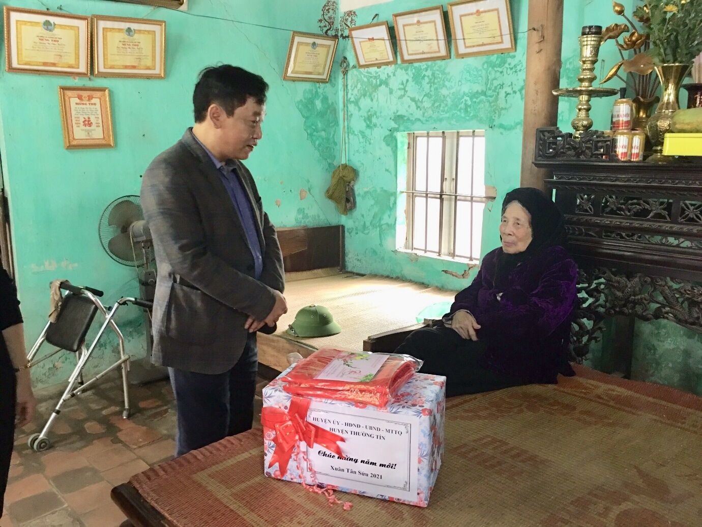 Đ/c Kiều Xuân Huy – Phó Bí thư Huyện ủy, Chủ tịch UBND huyện Thường Tín tặng quà tết bà mẹ Việt Nam anh hùng Nguyễn Thị Nhạn