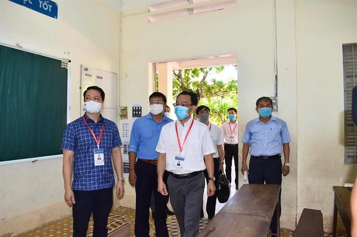Thứ trưởng Hoàng Minh Sơn và Đoàn kiểm tra của Ban Chỉ đạo quốc gia Kỳ thi tốt nghiệp THPT năm 2021 đã đến khảo sát, kiểm tra công tác chuẩn bị cho kỳ thi tại tỉnh Khánh Hòa. (Ảnh CTTĐT)