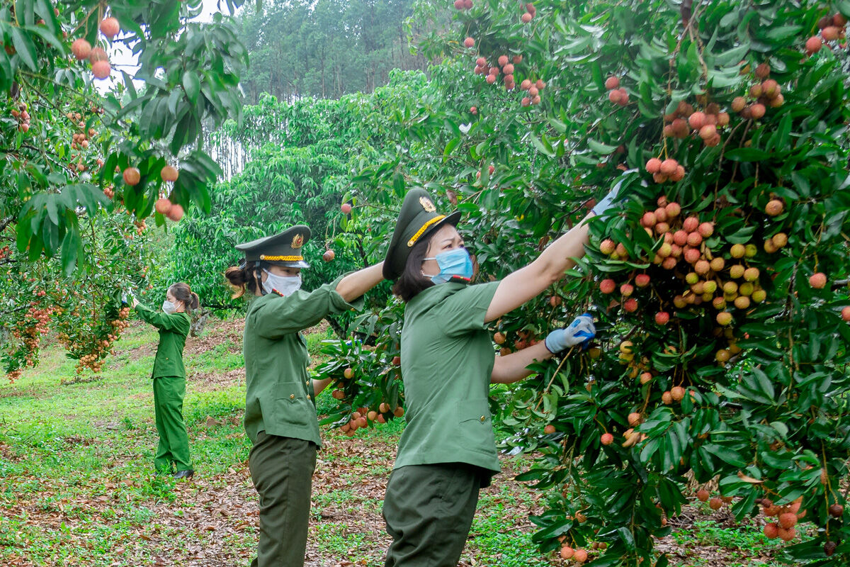 Cán bộ, chiến sĩ thuộc lực lượng Công an tỉnh Bắc Giang tích cực giúp nông dân thu hoạch vải thiều, khắc phục khó khăn do dịch bệnh_Nguồn: baobacgiang.com.vn