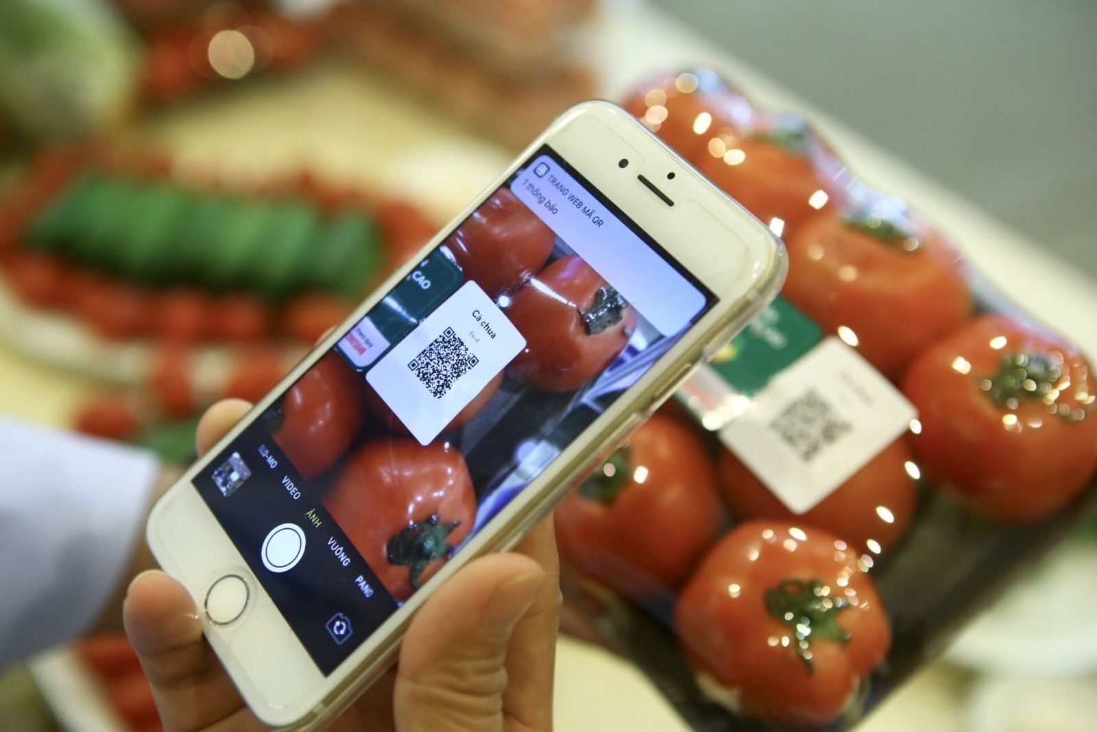 Người dùng quét mã QR Code của sản phẩm, điện thoại sẽ hiện thông báo truy xuất thông tin về nguồn gốc sản phẩm_Ảnh: TTXVN