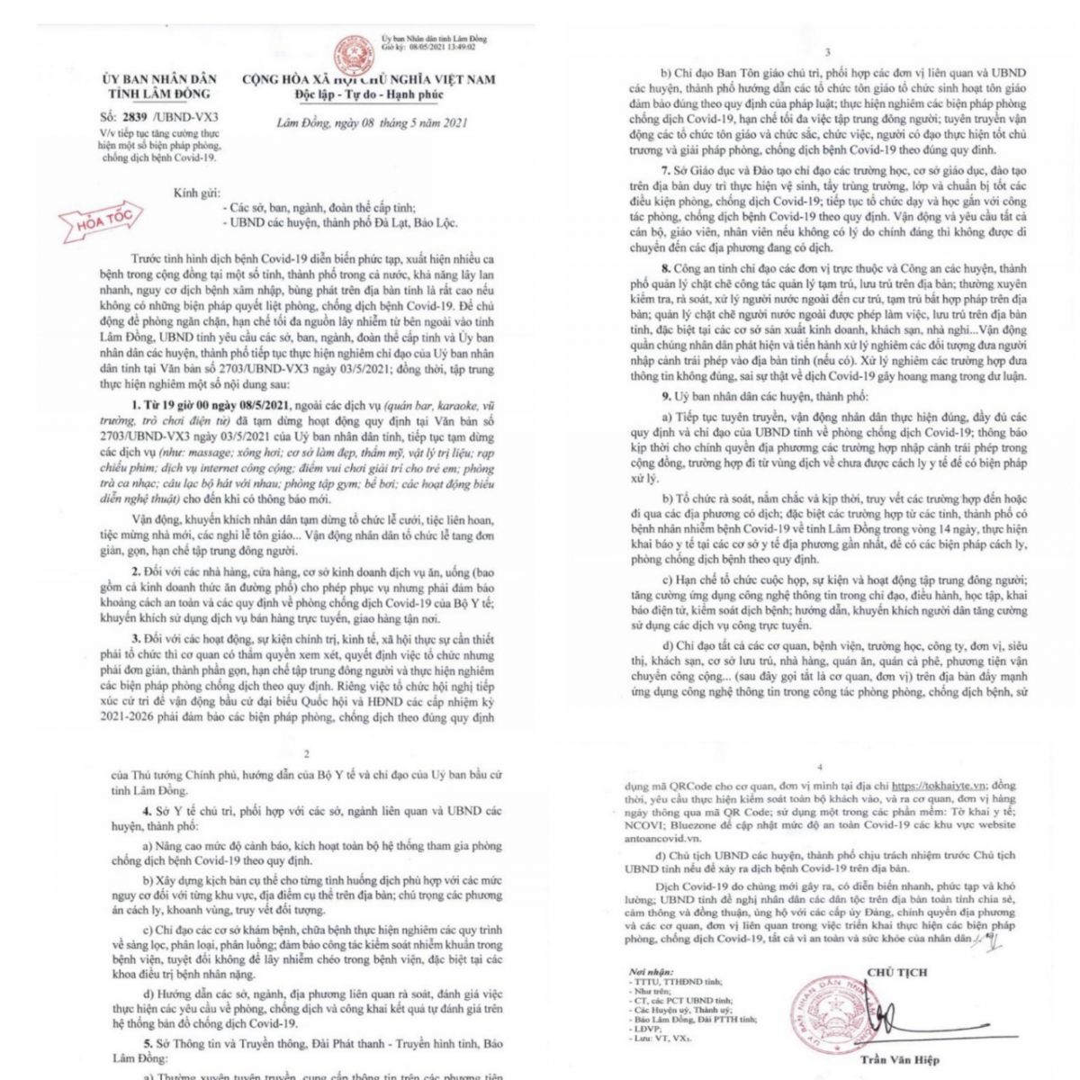 Ngày 8/5, UBND tỉnh Lâm Đồng đã có công văn hoả tốc số 2839/UBND-VX3 gửi các sở, ban, ngành, đoàn thể cấp tỉnh và UBND các huyện, thành phố về việc tiếp tục tăng cường các biện pháp phòng chống dịch Covid-19.