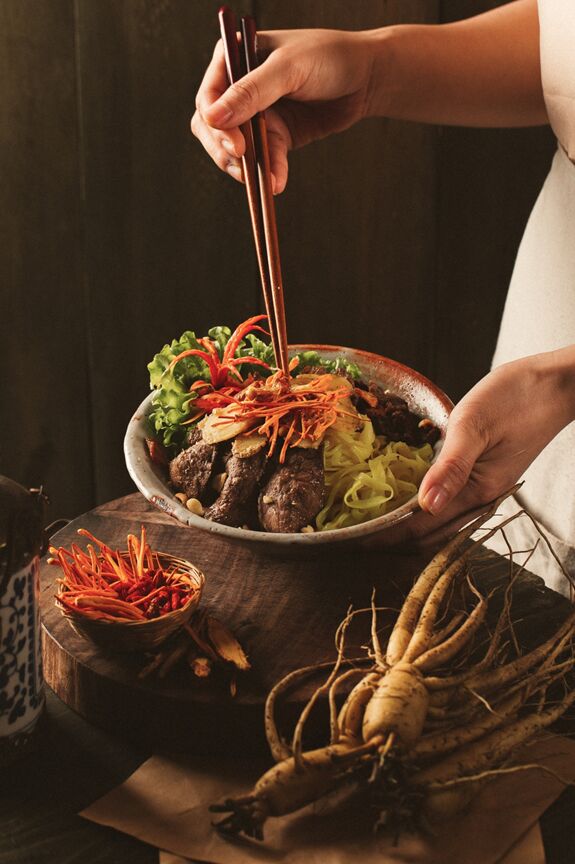 Bánh phở mềm ướt, sắc vàng tươi bắt mắt, rau lộc xanh non, lạc rang giòn thơm đẩy bật lên những miếng thịt bò nướng xào mềm, thơm phức kết hợp cùng nước trộn chua ngọt đậm đà nhưng vẫn giữ trọn vị thanh vốn có của phở trộn. Bát đặc biệt còn có thêm sâm bố chính và đông trùng hạ thảo đều là những vương dược giúp phòng chữa bệnh, bồi bổ và bảo vệ sức khỏe.