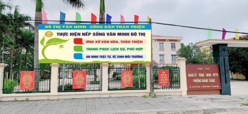 Pano tấm lớn tuyên truyền CVĐ “Người dân thành phố nói lời hay làm việc tốt, hành động thân thiện” tại cổng trụ sở phường Quảng Thắng.