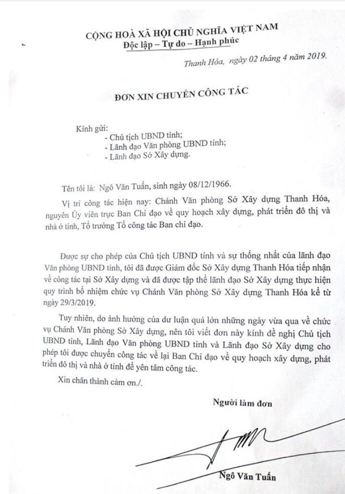 Đơn xin chuyển công tác của ông Tuấn vì không chịu được áp lực dư luận