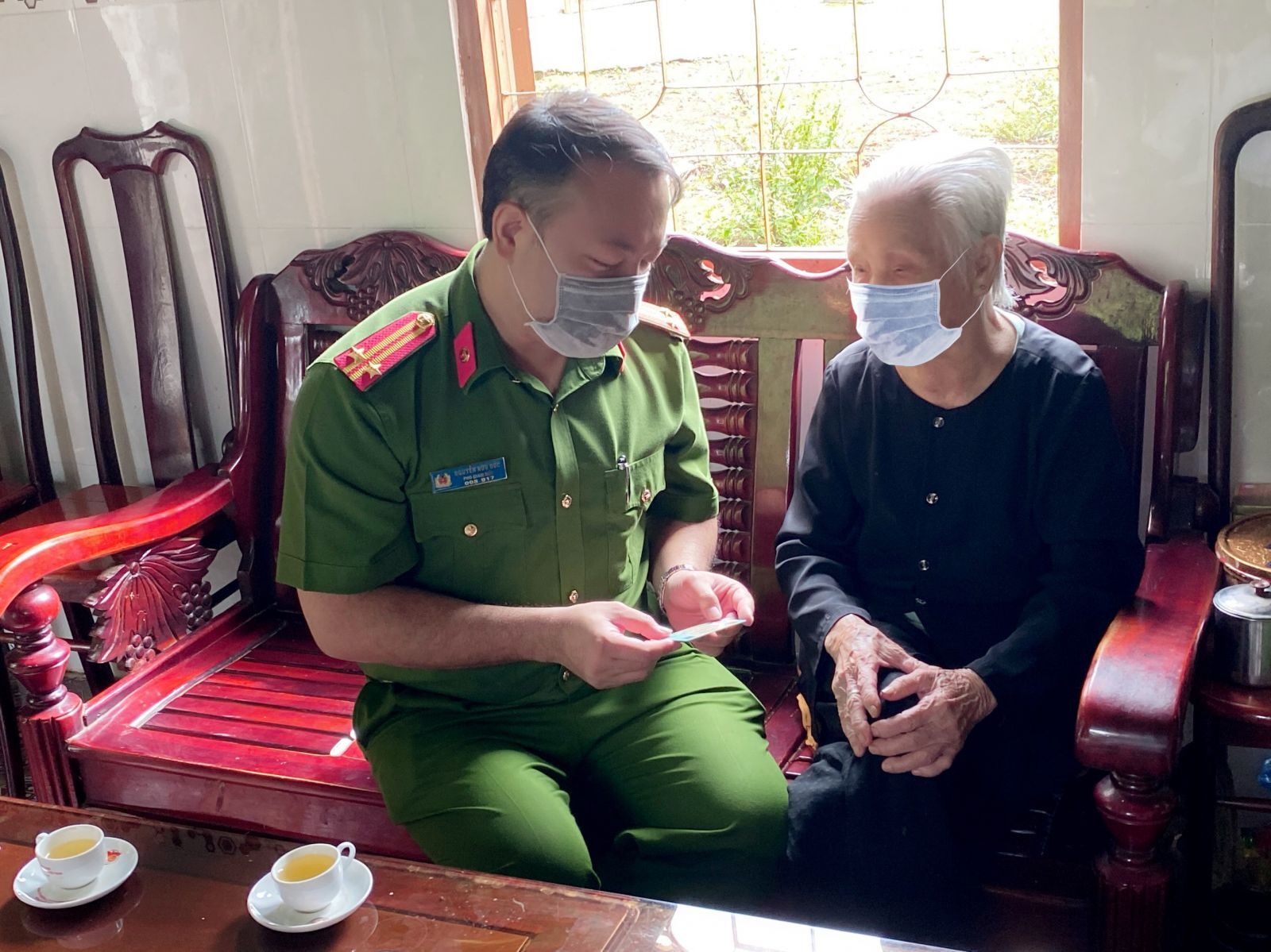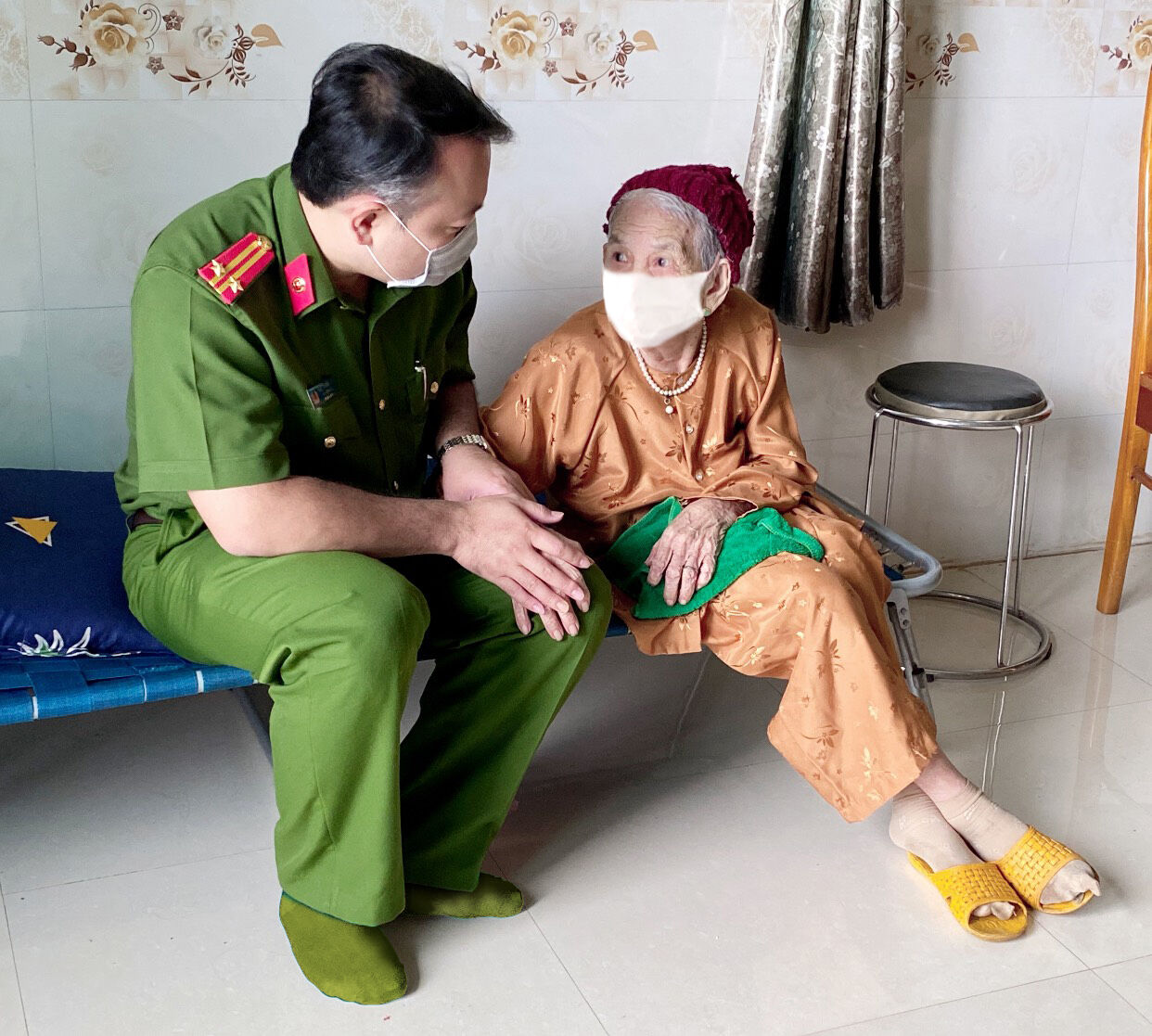 Trung tá Nguyễn Hữu Đức, Phó Giám đốc Công an tỉnh Đắk Nông động viên, thăm hỏi sức khỏe Mẹ Việt Nam anh hùng Bùi Thị Nhung.