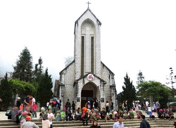 Khách du lịch tại nhà thờ cổ ở trung tâm thị trấn Sa Pa.