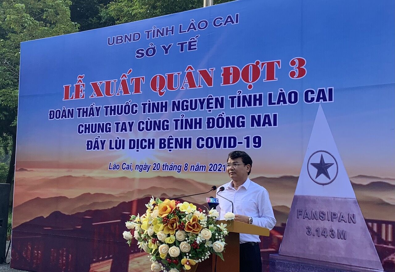 Đồng chí Hoàng Quốc Hương - Giám đốc Sở Y tế Lào Cai phát biểu phát động buổi lễ: Đáp ứng lời kêu gọi hỗ trợ của Sở Y tế tỉnh Đồng Nai, Đoàn cán bộ với 40 cán bộ chiến sĩ y tế ưu tú trong gần 4000 cán bộ chiến sĩ y tế của toàn tỉnh Lào Cai sẽ lên đường tiến vào Đồng Nai chống dịch. Thay mặt ngành y tế đồng chí cảm ơn 40 y, bác sĩ, nhân viên y tế đã tự nguyện làm đơn xin đi chống dịch, đồng thời gửi chúc sức khỏe, bình an, hoàn thành tốt nhiệm vụ tới Đoàn công tác. Đồng chí cũng đề nghị các thành viên trong đoàn phát huy tinh thần đoàn kết, tương thân tương ái, cống hiến hết khả năng của mỗi cá nhân để giúp tỉnh Đồng Nai đẩy lùi dịch bệnh.