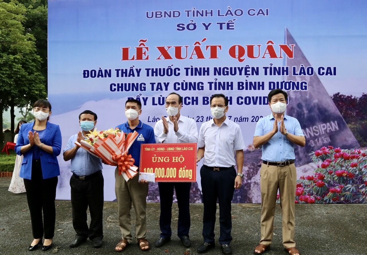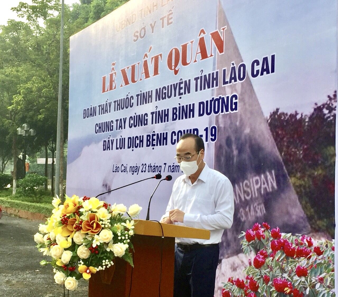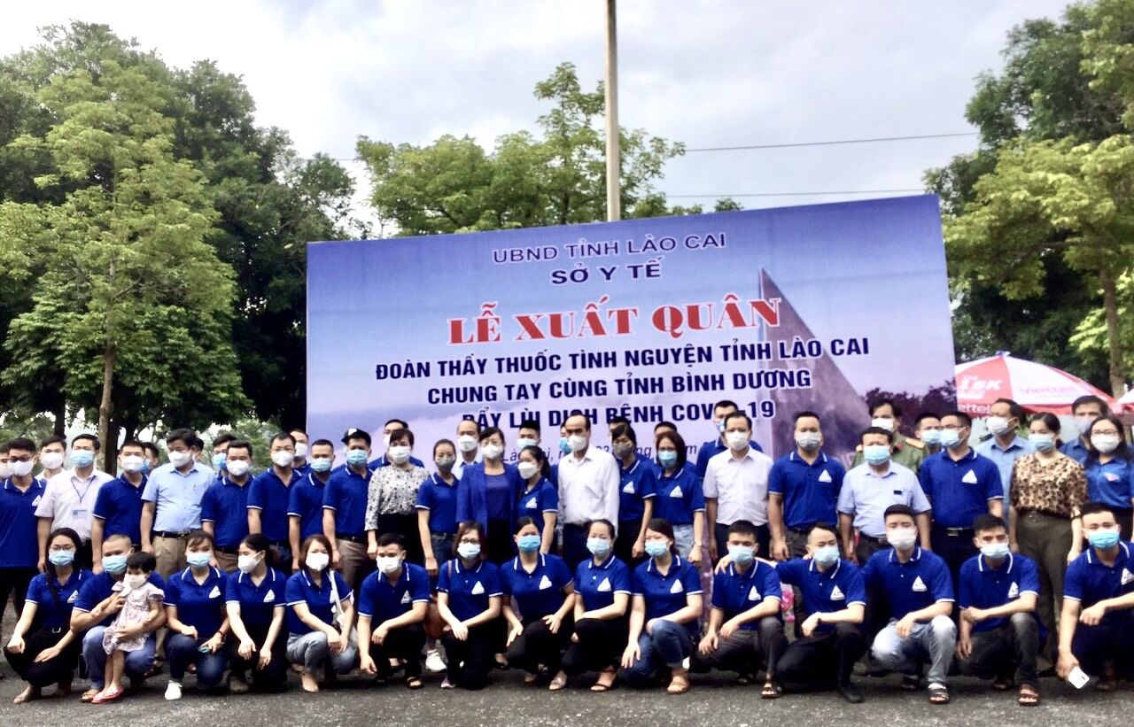 Theo báo cáo của Sở Y tế tỉnh Bình Dương, tính từ 17h00 ngày 21/7/2021 đến 6h00 ngày 22/7/2021, Bình Dương ghi nhận 94 ca mắc mới, nâng tổng số ca mắc Covid-19 tính từ đợt dịch lần thứ 4 trên địa bàn tỉnh lên 4.783 ca. Lực lượng y tế tỉnh Bình Dương mặc dù đã được các tỉnh trong toàn quốc liên tục tăng cường chi viện nhưng vẫn phải gồng mình thực hiện nhiệm vụ chống dịch. Thực hiện ý kiến chỉ đạo của Thường trực Tỉnh ủy Lào Cai tại thông báo số 823/QĐ-TU ngày 21/7/2021 về việc cử cán bộ y tế tham gia hỗ trợ tỉnh Bình Dương chống dịch Covid-19, ngày 22/7/2021, Chủ tịch UBND tỉnh đã ban hành quyết định cử đoàn công tác hỗ trợ tỉnh Bình Dương. Sáng ngày 23/7, Sở Y tế Lào Cai tổ chức lễ xuất quân Đoàn thầy thuốc tình nguyện Lào Cai chung tay cùng tỉnh Bình Dương đẩy lùi dịch bệnh. Trong đoàn công tác lần này gồm có 50 cán bộ y bác sĩ tham gia, đồng chí Nguyễn Hải Sơn, Thạc sỹ y tế công cộng, Chi cục trưởng Chi cục an toàn Vệ sinh thực phẩm làm trưởng đoàn.