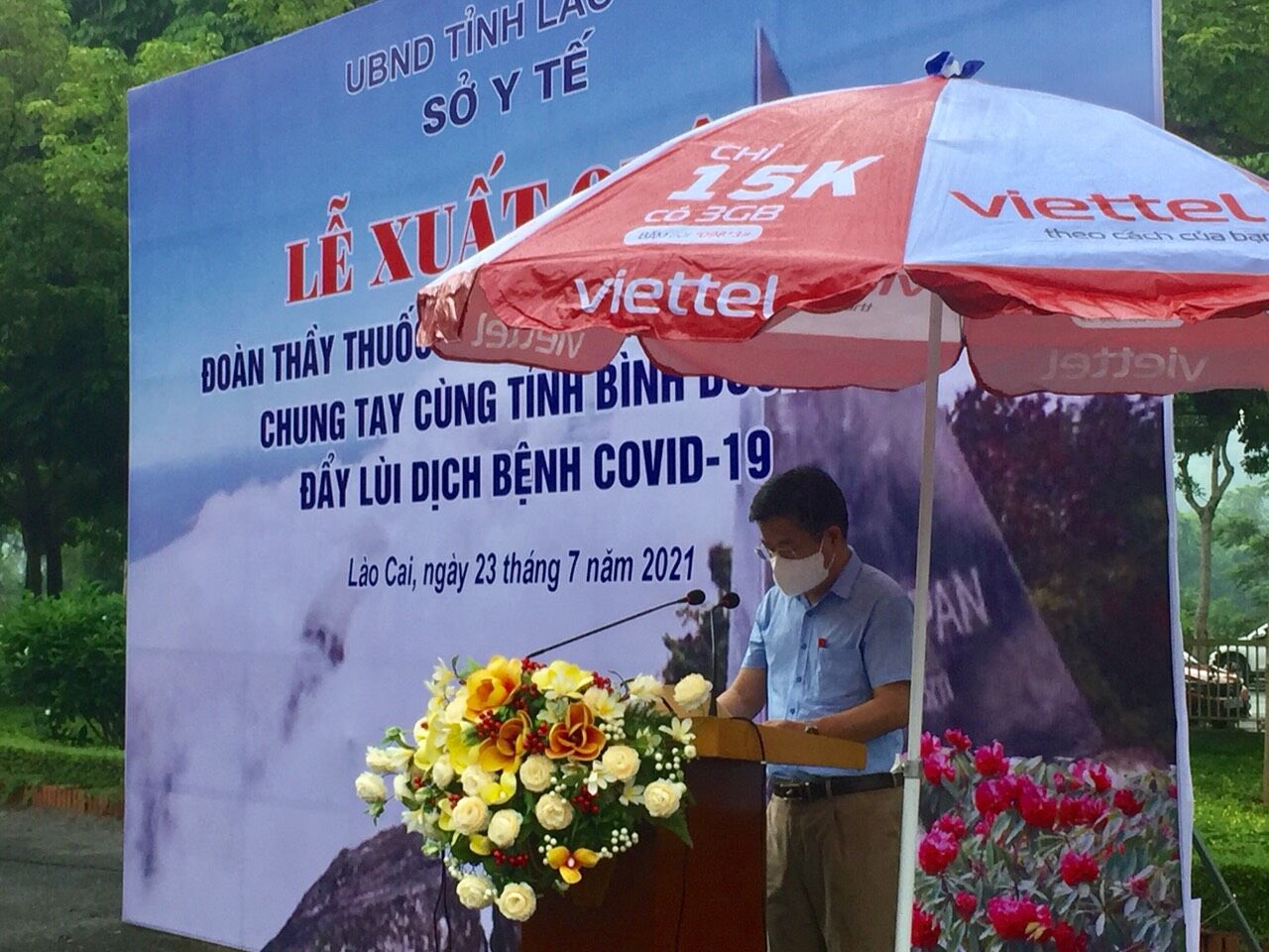 Đồng chí Hoàng Quốc Hương - Giám đốc Sở Y tế Lào Cai phát biểu phát động buổi lễ: Đáp ứng lời kêu gọi hỗ trợ của UBND tỉnh Bình Dương, Đoàn cán bộ với 50 cán bộ chiến sĩ y tế ưu tú trong gần 4000 cán bộ chiến sĩ y tế của toàn tỉnh Lào Cai sẽ lên đường tiến vào Bình Dương chống dịch, thay mặt ngành y tế đồng chí cảm ơn 50 y, bác sĩ, nhân viên y tế đồng thời gửi chúc sức khỏe, bình an, hoàn thành tốt nhiệm vụ tới đoàn công tác. Đồng chí cũng đề nghị các thành viên trong đoàn cần phát huy tinh thần đoàn kết, tương thân tương ái, cống hiến hết khả năng của mỗi cá nhân để giúp tỉnh Bình Dương đẩy lùi dịch bệnh.