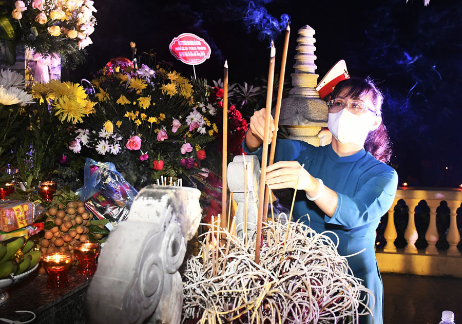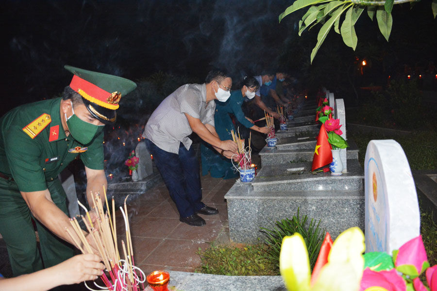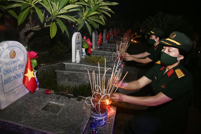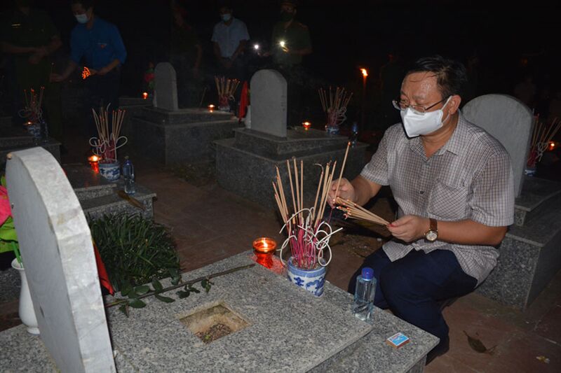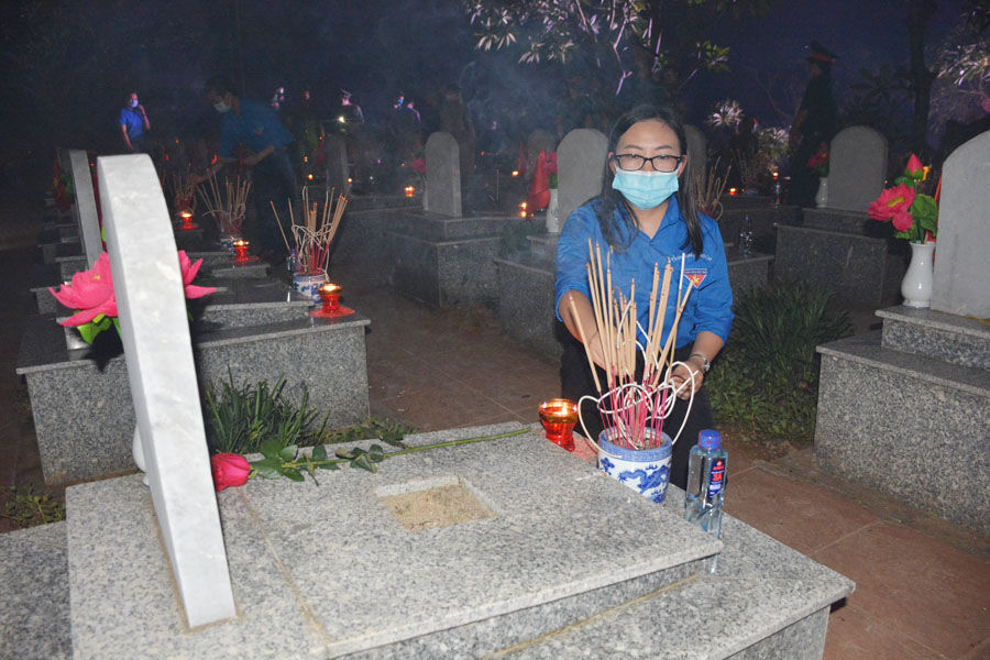 Tại thời điểm khoảnh khắc linh thiêng đầy xúc động, phần mộ của các anh hùng liệt sỹ tại Nghĩa trang liệt sỹ phường Nam Cường (thành phố Lào Cai) đã được thắp sáng lung linh trong ánh nến và hương hoa của đại biểu, các đoàn viên, thanh niên và Nhân dân tỉnh Lào Cai.