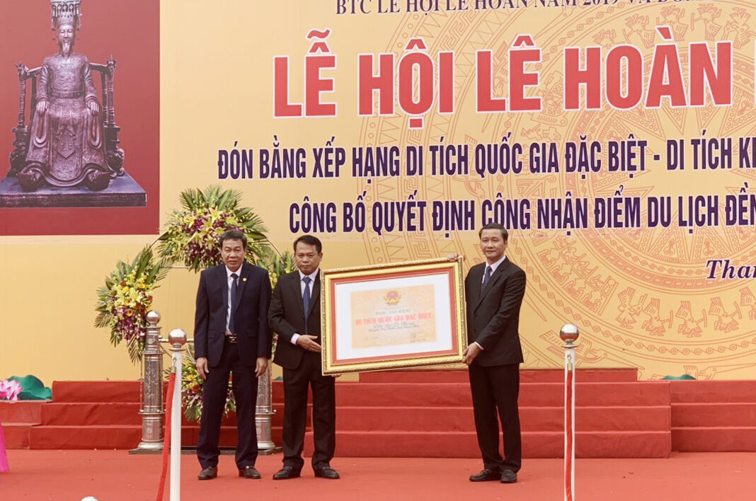 VNHN - Hòa chung trong không khí phấn khởi của nhân dân cả nước và nhân dân tỉnh Thanh Hóa chào mừng những ngày kỉ niệm lớn của đất nước của quê hương, thiết thực chào mừng 990 năm danh xưng Thanh Hóa. Thực hiện quyết định số 1820/QĐ-CP Ngày 24 tháng 12 năm 2018 của Thủ tướng Chính phủ về việc xếp hạng di tích Quốc Gia đặc biệt, được sự đồng ý của Thường trực tỉnh ủy, UBND tỉnh Thanh Hóa, ngày 12 /04 /2019 lãnh đạo huyện Thọ Xuân cũng như bà con nhân dân xã Xuân Lập long trọng đón nhận Bằng xếp hạng di tích Quốc gia đặc biệt - di tích kiến trúc nghệ thuật đền thờ Lê Hoàn, công bố quyết định công nhận điểm du lịch đền thờ Lê Hoàn huyện Thọ Xuân.