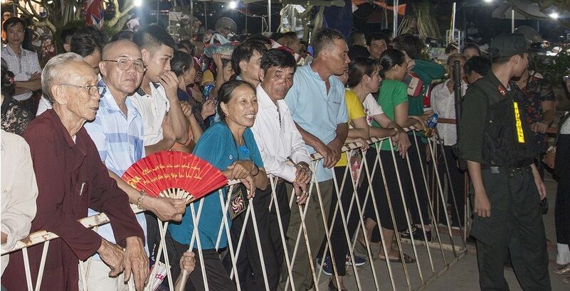 Đội tình nguyện viên và lực lượng an ninh được bố trí tạo thành những lối đi hướng dẫn du khách vào viếng đền và xin ấn.