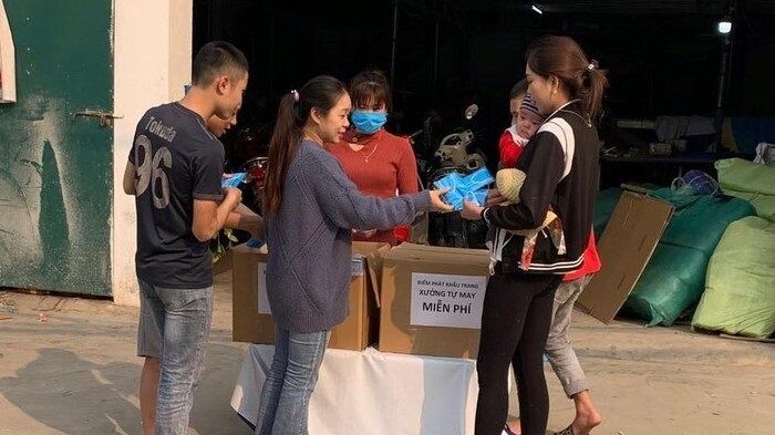 Chị Thắm kể: “Nhà tôi may áo mưa chứ không làm khẩu trang. Nhưng thấy trong đợt dịch Covid-19 này mọi người tìm mua khẩu trang khó khăn quá, thậm chí còn phải mua đắt, sẵn có máy may nên vợ chồng tôi quyết định cắt cử 6 người trong hệ thống may áo mưa để làm khẩu trang phát tặng miễn phí”. Nghĩ là làm, chị mua vải không dệt QL40 chuyên dùng để may khẩu trang y tế, tính toán may được ít nhất 10.000 cái phục vụ mọi người.