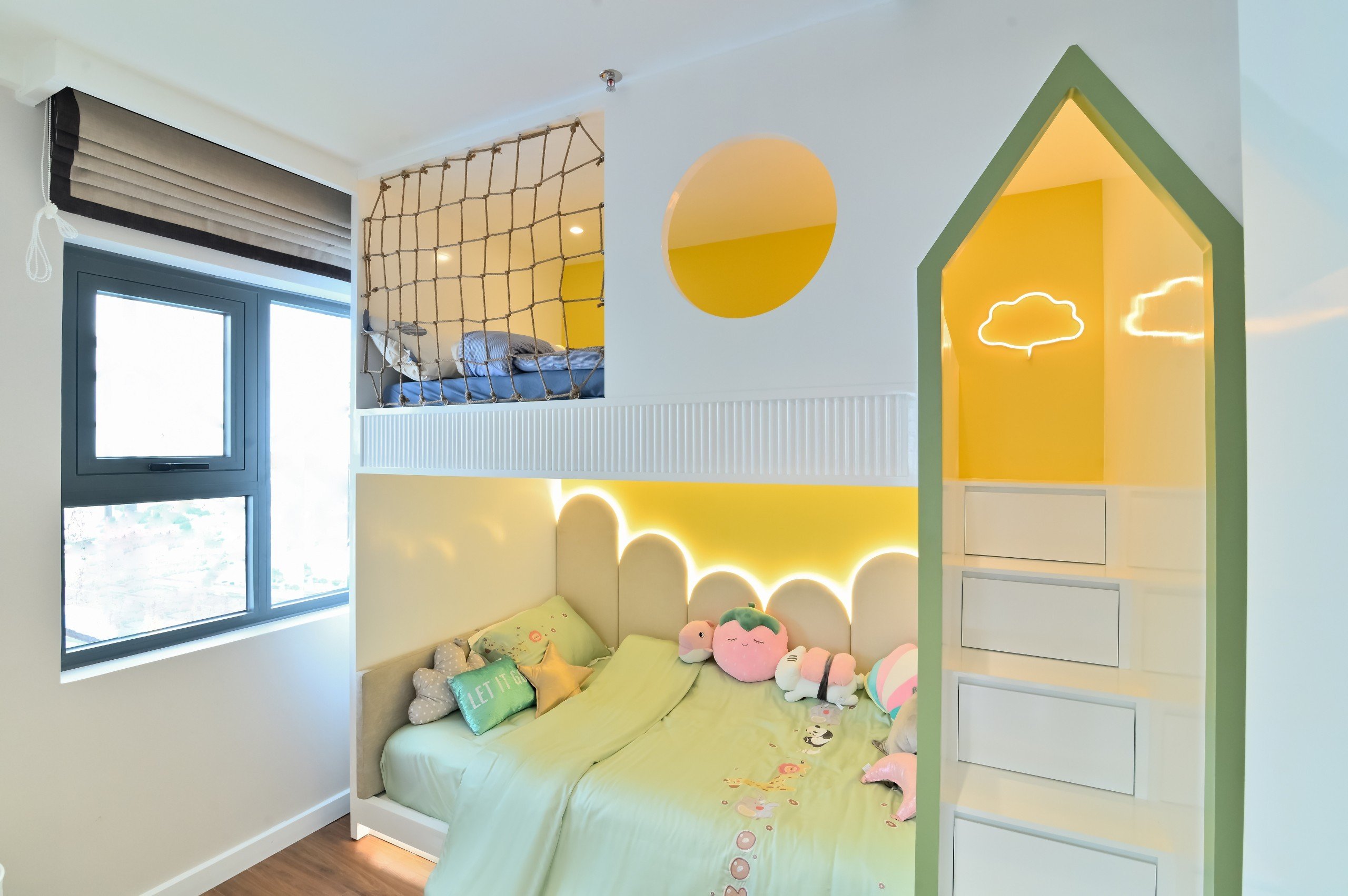 Phòng ngủ cho trẻ với thiết kế hiện đại, nhiều màu sắc thú vị. Không gian căn phòng rộng rãi được trang bị đầy đủ nội thất từ giường ngủ, tủ quần áo được bài trí một cách khoa học.