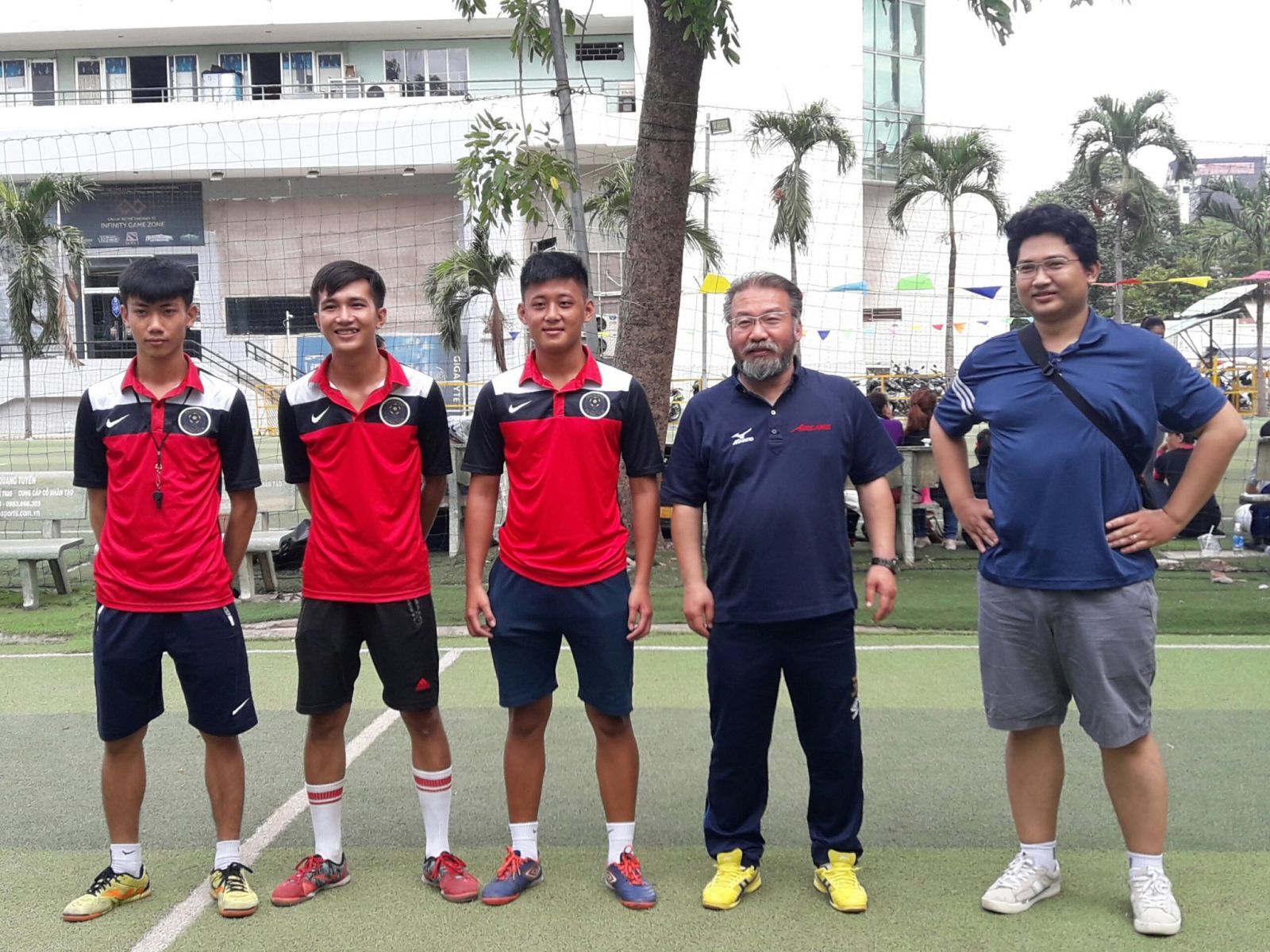 Ông Nagamoto (mặc áo quần màu xanh) chụp hình cùng các huấn luyện viên