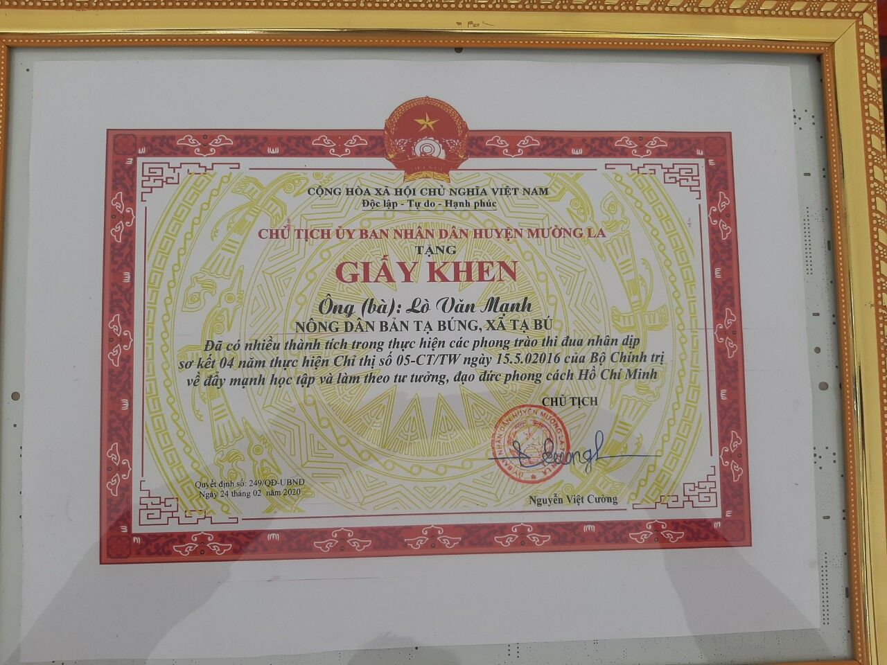 Lãnh đạo huyện Mường La tặng giấy khen cho các thành viên.
