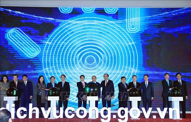 Thủ tướng Nguyễn Xuân Phúc và các đại biểu thực hiện nghi thức khai trương Cổng Dịch vụ công Quốc gia. Ảnh: TTXVN