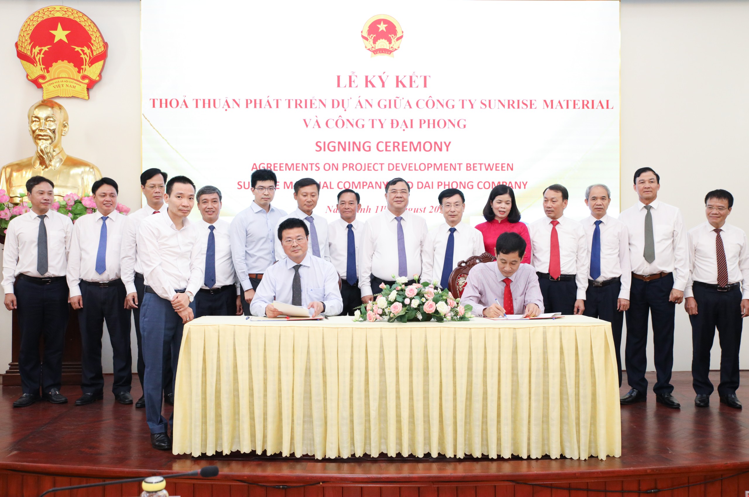 Các đồng chí: Phạm Gia Túc, Ủy viên Trung ương Đảng, Bí thư Tỉnh ủy; Phạm Đình Nghị, Chủ tịch UBND tỉnh chứng kiến lễ ký thỏa thuận phát triển dự án giữa Công ty Sunrise Material (Singapore) và Công ty Đại Phong để phát lĩnh vực màng bọc polyme tại Nam Định.
