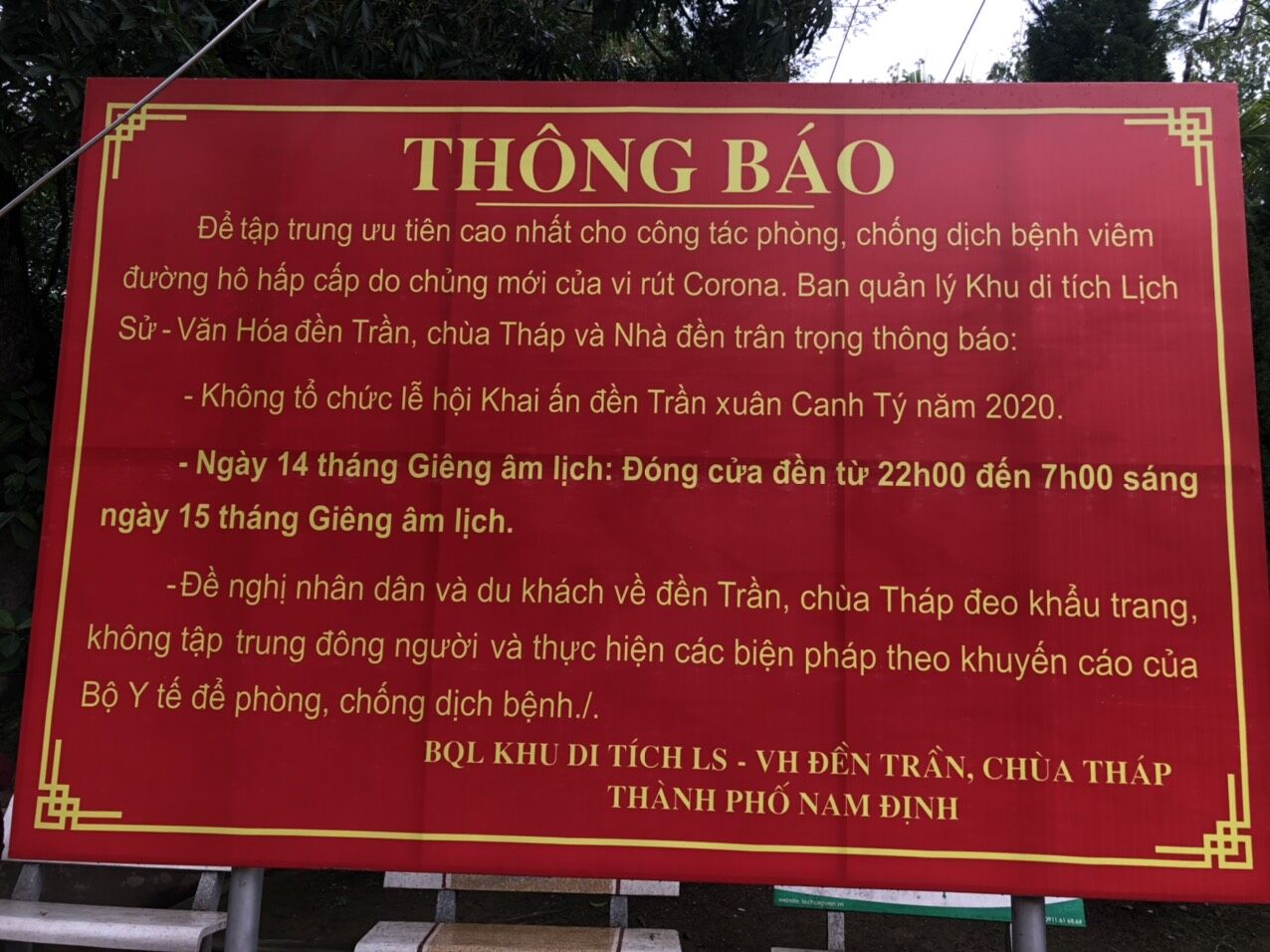 Trước đó, ngày 1/2, UBND thành phố Nam Định, đã có thông báo về việc dừng tổ chức Lễ hội Khai ấn đền Trần xuân Canh Tý 2020, dừng tất cả mọi hoạt động trong lễ hội đền Trần kể cả ở quy mô địa phương, nhà đền để tránh tập trung đông người.