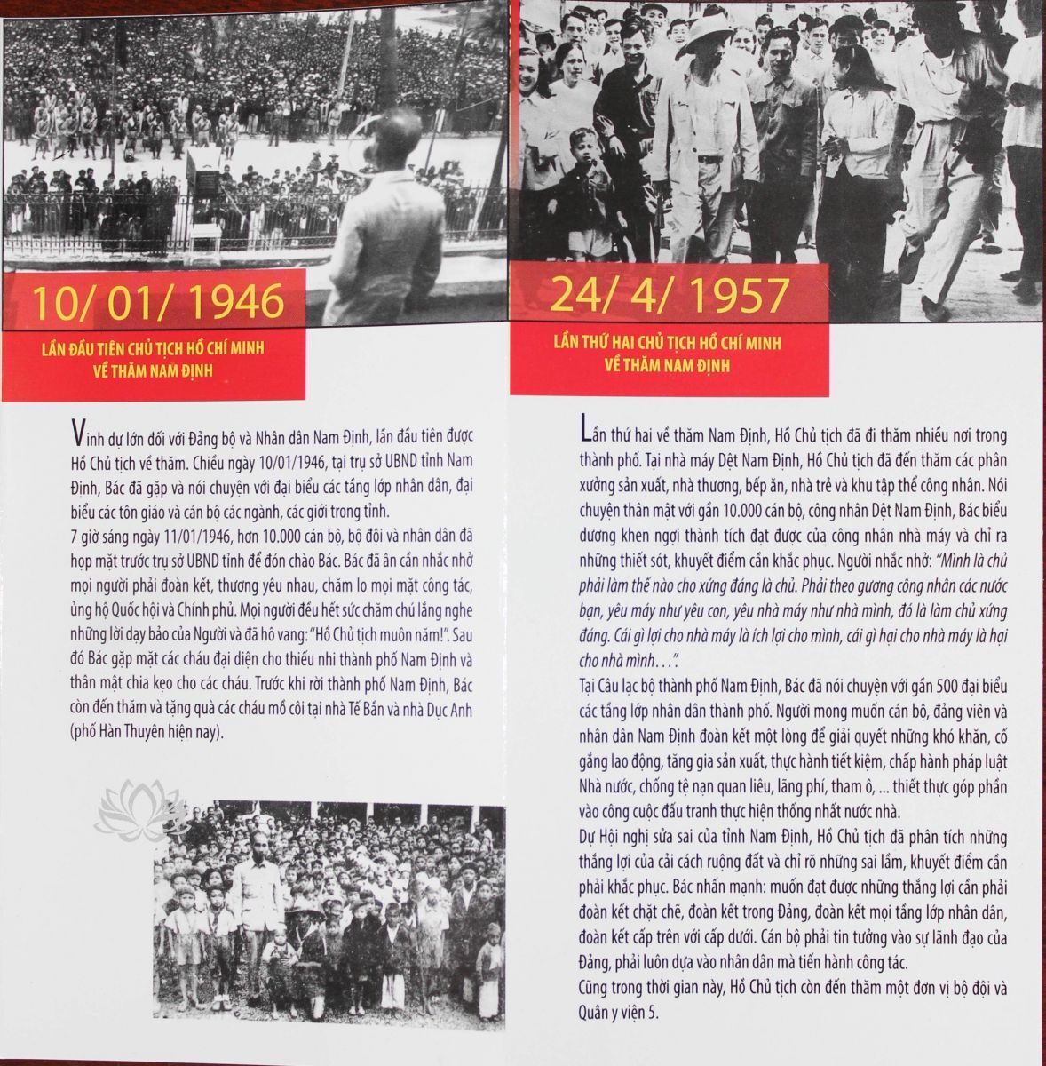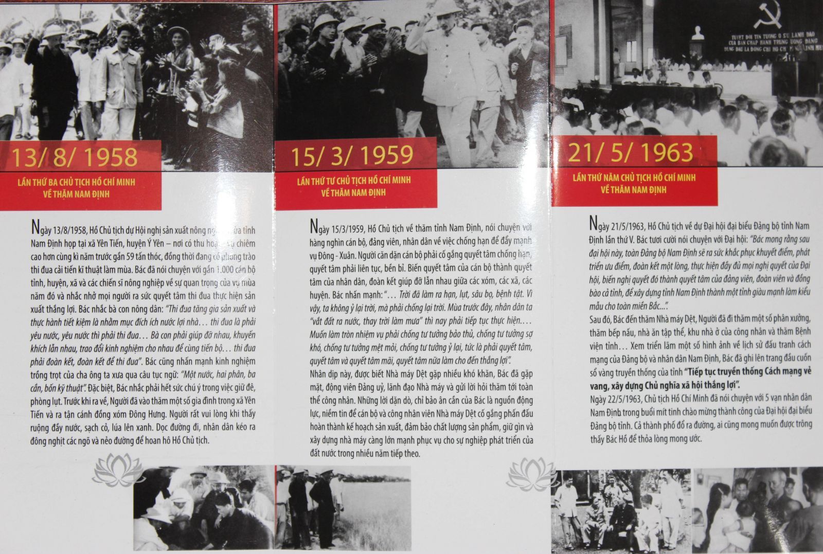Chủ đề “Bác Hồ với Đảng bộ và nhân dân Nam Định” giới thiệu những hình ảnh, kỷ vật thiêng liêng về Bác qua 5 lần Bác về thăm và làm việc với Đảng bộ và nhân dân tỉnh Nam Định. Qua đó, chúng ta có thể hiểu rõ hơn tình cảm và sự quan tâm của Bác dành cho tỉnh nhà. Đây cũng là vinh dự, nguồn động lực to lớn để toàn Đảng, toàn quân, toàn dân tỉnh Nam Định đoàn kết, quyết tâm thực hiện thắng lợi lời dạy của Bác.
