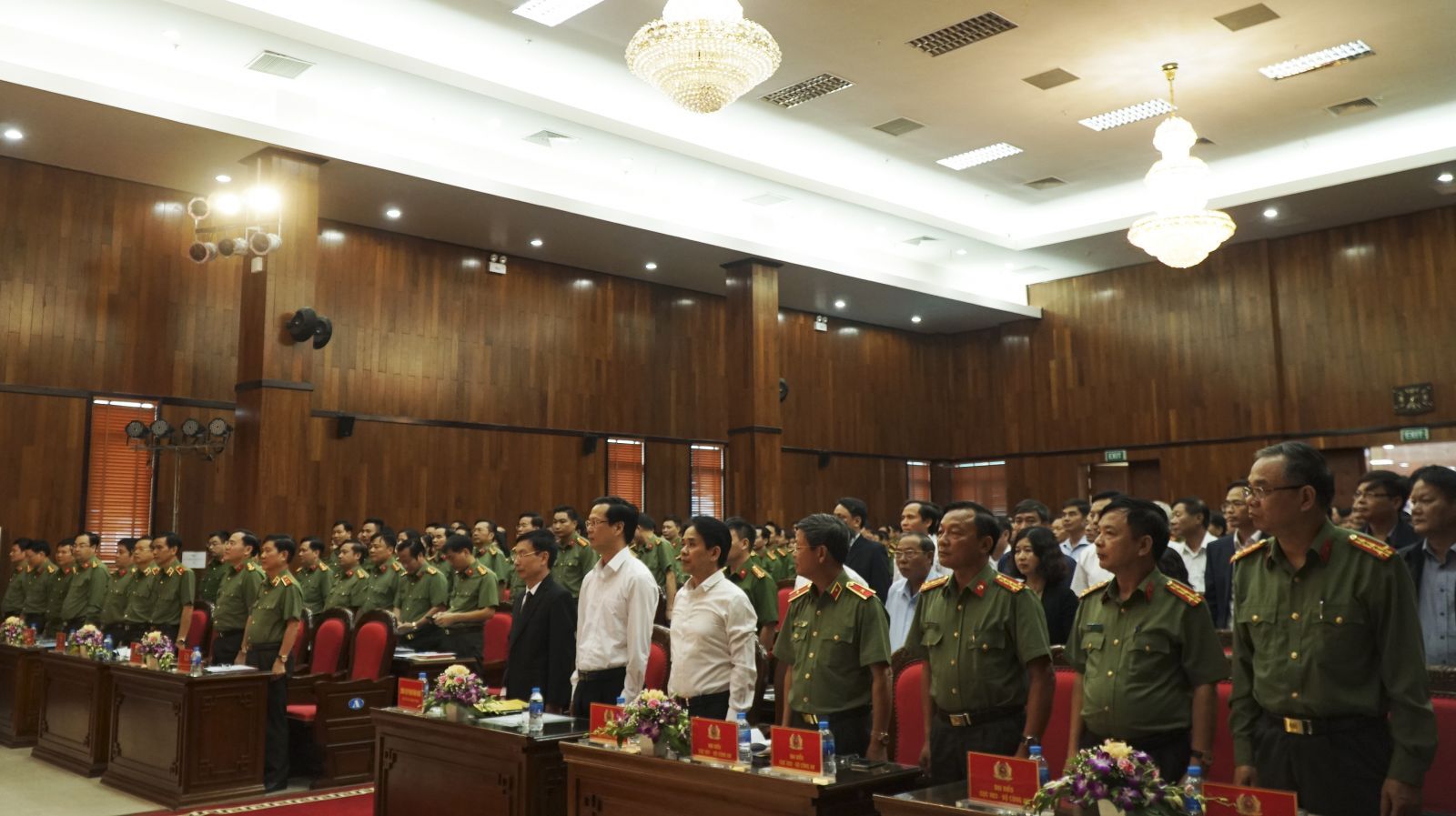Trung tướng Nguyễn Văn Sơn - Thứ trưởng Bộ Công an (bên phải) chỉ đạo Hội nghị, Đại tá Phạm Văn Long, Giám đốc Công an tỉnh (bên trái) chủ trì Hội nghị