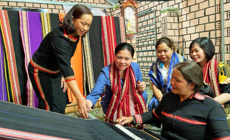 Ủy viên Trung ương Đảng, Chủ tịch Hội Liên hiệp Phụ nữ Việt Nam Hà Thị Nga thăm mô hình Câu lạc bộ Phụ nữ dệt thổ cẩm tỉnh Gia Lai_Nguồn: baogialai.com.vn