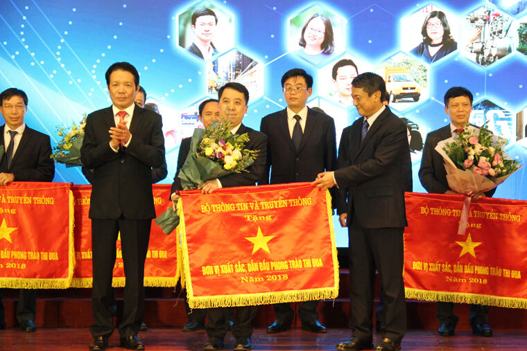 Thứ trưởng Phạm Hồng Hải và Thứ trưởng Hoàng Vĩnh Bảo trao Cờ thi đua xuất sắc năm 2018 của Bộ TT&TT cho Trung tâm Chứng thực điện tử quốc gia