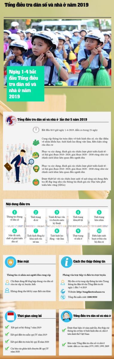 VNHN-Vào lúc 0h00 ngày 1/4/2019, cuộc tổng điều tra về dân số và nhà ở với quy mô toàn quốc sẽ chính thức bắt đầu, với sự tham gia của hơn 122.000 điều tra viên. Thông tin chung về dân số, tình trạng di cư, hôn nhân, mức độ sinh - chết và phát triển dân số, tình trạng lao động, việc làm, tình trạng về nhà ở và nhiều nội dung thông tin khác sẽ được Tổng cục Thống kê tiến hành thu thập.