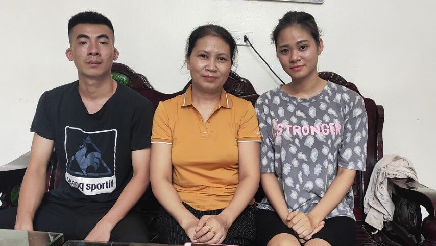 Nguyễn Viết Sơn và cô giáo chủ nhiệm Lê Thu Hà cùng chị gái Nguyễn Huyền Trang