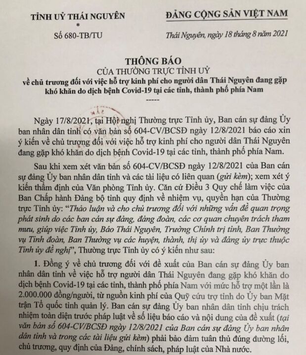 Ngày 18/8/2021, thường trực Tỉnh ủy Thái Nguyên đã chấp thuận chủ trương tại Thông báo số 680-TB/TU về việc hỗ trợ kinh phí cho người dân Thái Nguyên đang gặp khó khăn do dịch bệnh COVID-19 tại các tỉnh, thành phố phía Nam.