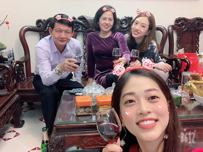 Á hậu Bùi Phương Nga cùng bố mẹ và chị gái nâng ly chúc mừng năm mới