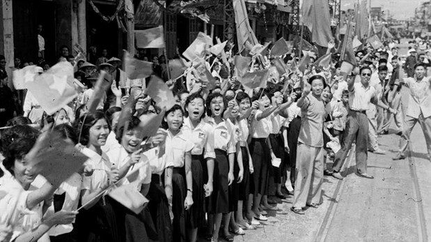 Nhân dân Thủ đô với cờ hoa rợp trời vui mừng đón đoàn quân Giải phóng ngày 10/10/1954.