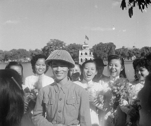 Nữ sinh Hà Nội đón chào Thiếu tướng Vương Thừa Vũ, Chủ tịch Ủy ban Quân chính Hà Nội, người dẫn đầu đoàn quân chiến thắng về giải phóng Thủ đô.