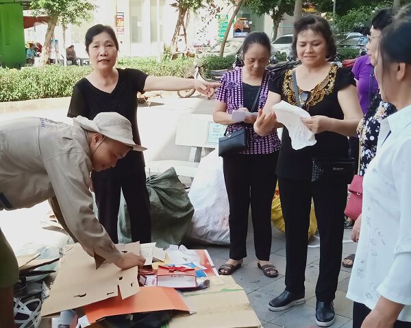 Bà Nguyễn Thị Yên (bên trái) cùng các hội viên TDP 19 đang thu gom, bán phế liệu gây quỹ