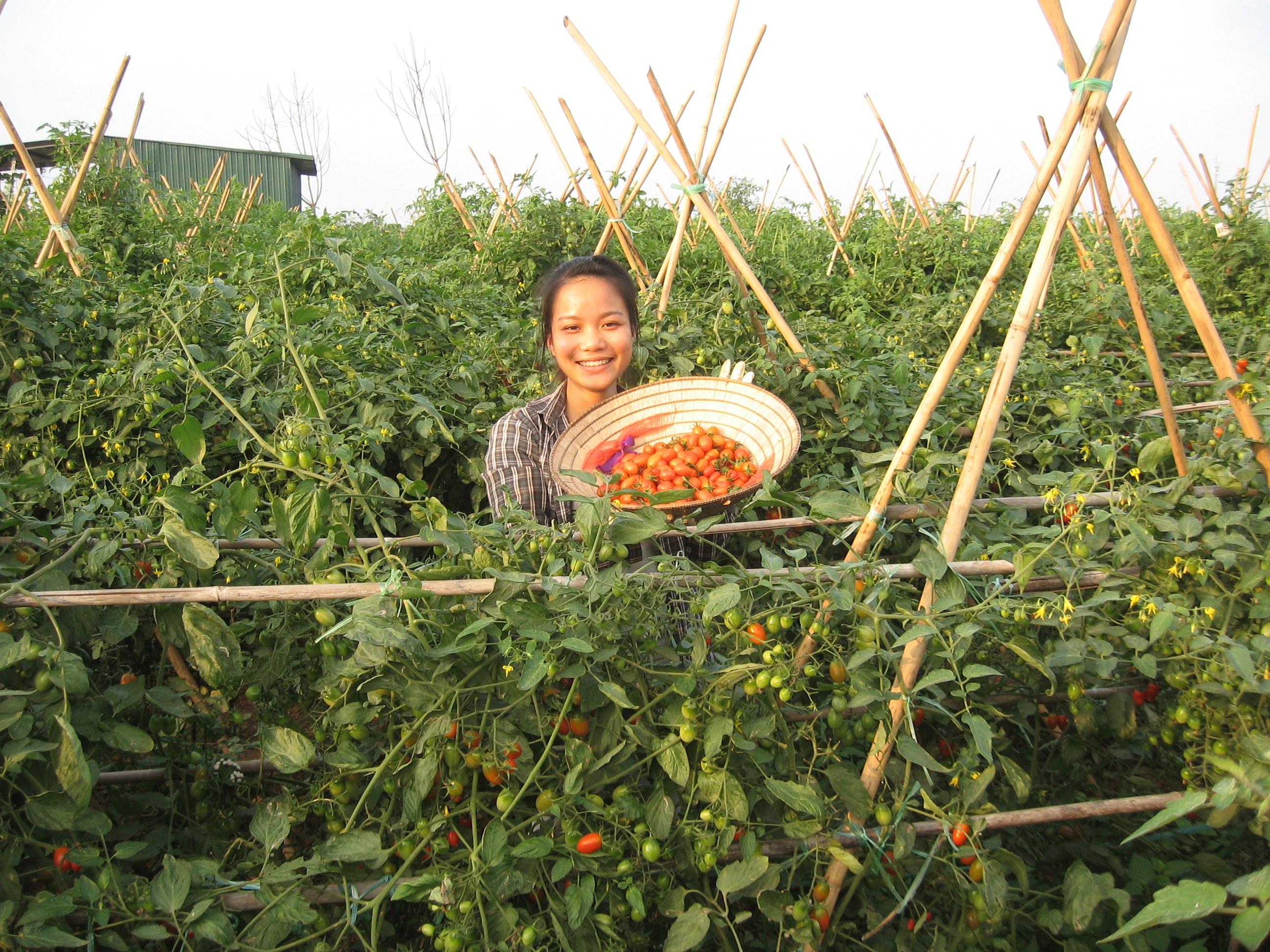 Niềm vui của người lao động khi thu hái cà chua chất lượng cao.