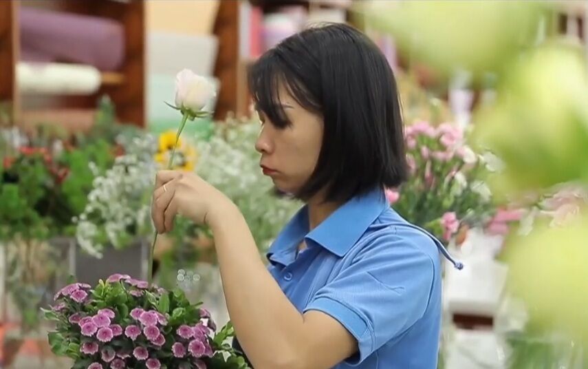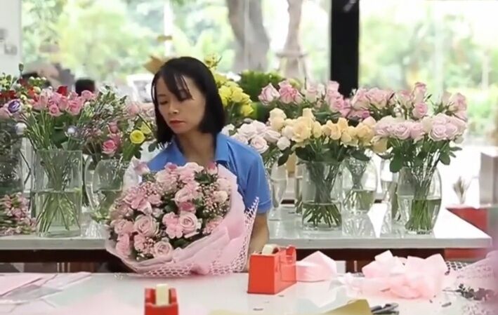 Chị Nguyễn Thị Dung tại shop hoa của riêng mình Hoa Tươi Trăng Khuyết tại 12 Phố Chợ, phường Tân Thành, Quận Tân Phú, Thành phố Hồ Chí Minh