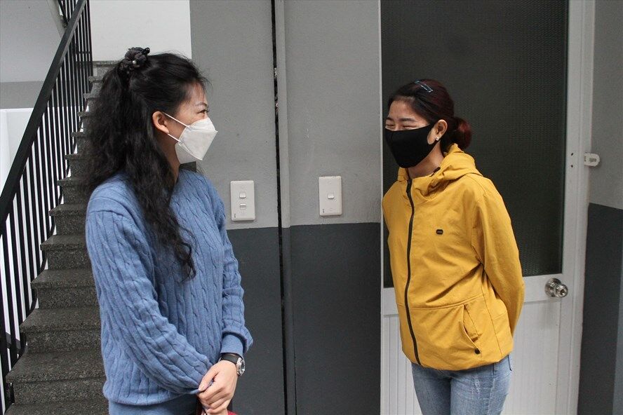 Chị Nguyễn Thị Thúy Ngân (trái) thông báo việc miễn, giảm giá phòng tới công nhân ký túc xá Sen. Ảnh: laodong.vn